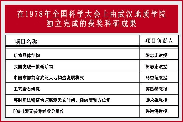 大会举行了隆重的颁奖仪式,表彰了新中国成立以来近30年全国各条战线涌现出来的7657项科研成果,表彰了826个先进集体和1192名先进科技工作者。武汉地质学院受到表彰的重大科技成果28项,其中由我校独立完成的成果6项,与兄弟单位合作完成科研成果22项。彭志忠被评为先进科技工作者,他领导的实验室荣获先进集体奖,他领衔研究的矿物晶体结构、我国发现一批新矿物等2项成果是6项我校独立完成的获奖成果中的两项,占比1/3。武汉地质学院被授予10份奖状,其中有4份是颁给彭志忠的,占比40%。学校获奖数量居于湖北省乃至全国高等院校前列。这是对我校武汉地质学院时期办学水平的充分肯定和鼓励鞭策,也是对彭志忠的莫大肯定和鼓舞。包括我校在内的全国科教工作者的积极性、创造性被有效激发出来,只争朝夕、奋发图强,为早日实现科学技术现代化多作贡献的氛围很快浓厚起来。