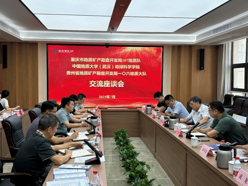 在205地质队,队党委书记张天贵、队长邝光升、队党委委员谢桃园、科创中心主任闫慧、生态地质研究院院长蒲刚、副院长兼总工程师齐小兵等参加座谈会,与会人员观看了地质队宣传片,队长邝光升介绍了在矿产地质、地质灾害防治、生态修复等方面取得的突出成果和成果转化情况,党委书记张天贵介绍了单位技术人才情况和毕业生招聘和人才计划情况,表达了与学院在产学研方面深化合作的期望,王连训教授介绍了前期与队里的项目合作情况与取得的成果等。在107地质队,队党委书记易宗旺、队长程礼军、首席专家唐将、地质矿产研究院院长勾杰、院总工程师牟佳佳、AI地矿研究院负责人李珂及部分校友等参加座谈会,会前队长程礼军带领大家参观了队史馆,介绍了107地质队的发展历程与取得的突出成果,座谈会上唐将与程礼军分别介绍了科技创新、找矿成果以及在实际生产中未来突破方向和合作需求,党委书记易宗旺回顾了两个月前在武汉座谈交流中达成的合作共识并表示进一步加强交流加快合作,贵州地矿局106地质队首席专家翁申富结合地质e站建设分享了对沉积型矿产勘查方面的经验,余文超教授介绍了与贵州地矿局106地质队在找矿方面的合作情况和通过与107队项目合作对重庆沉积型矿床的认识等。各单位与会人员结合自己的工作岗位和业务情况进行了充分交流。在观看学校宣传片《奋进》的基础上,刘世勇介绍了学校及学院的整体情况以及学院的科研优势与特色,并表示希望以此次交流为契机,推动双方在人才培养与就业、科研项目联合攻关,科研平台开放共享等方面深入合作,共同推进教育、科技、人才一体化建设,座谈会结束后,分别与两个单位签署了产学研合作协议,并举行了“地质e站”揭牌仪式。
