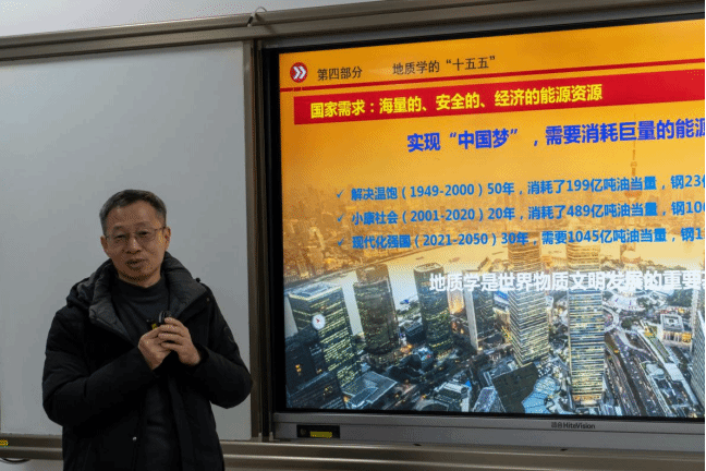 授课过程中,章军锋副校长从全会召开的基本情况、时代背景和重要意义出发,围绕国家发展大局、高等教育趋势与地质学学科前景三大核心展开授课。他首先系统梳理了中央政治局过往工作成效与“十四五”时期发展成就,深入解读“十五五”时期经济社会发展的重要原则和主要目标,结合国家对教育、科技、能源资源等领域的战略部署,强调地学学子应主动对接国家需求,将个人发展融入民族复兴伟业。