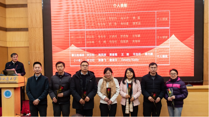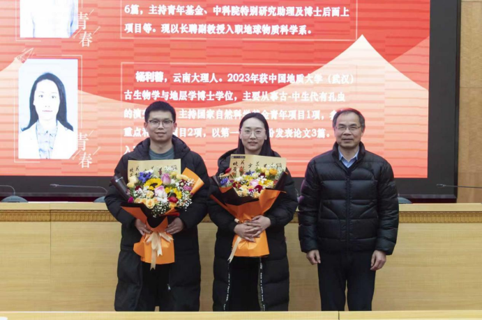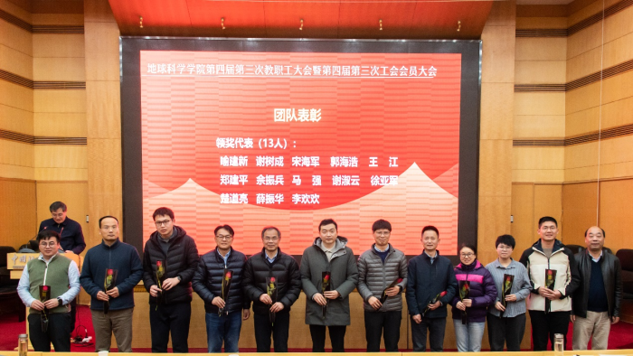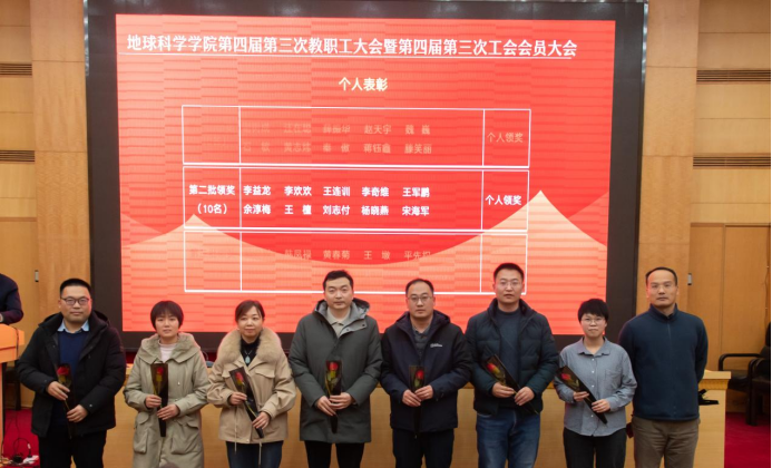 会议第三阶段是荣休仪式-入职仪式与年度表彰会。院长吴元保为荣休教师张宁和徐晓东献花,感谢他们多年来的辛勤付出和无私奉献。谢树成院士为新入职教师杨传茂和杨利蓉献花,欢迎他们加入地球科学学院。会议并对年度优秀团队和个人进行了表彰,鼓励大家向先进集体和先进个人学习。