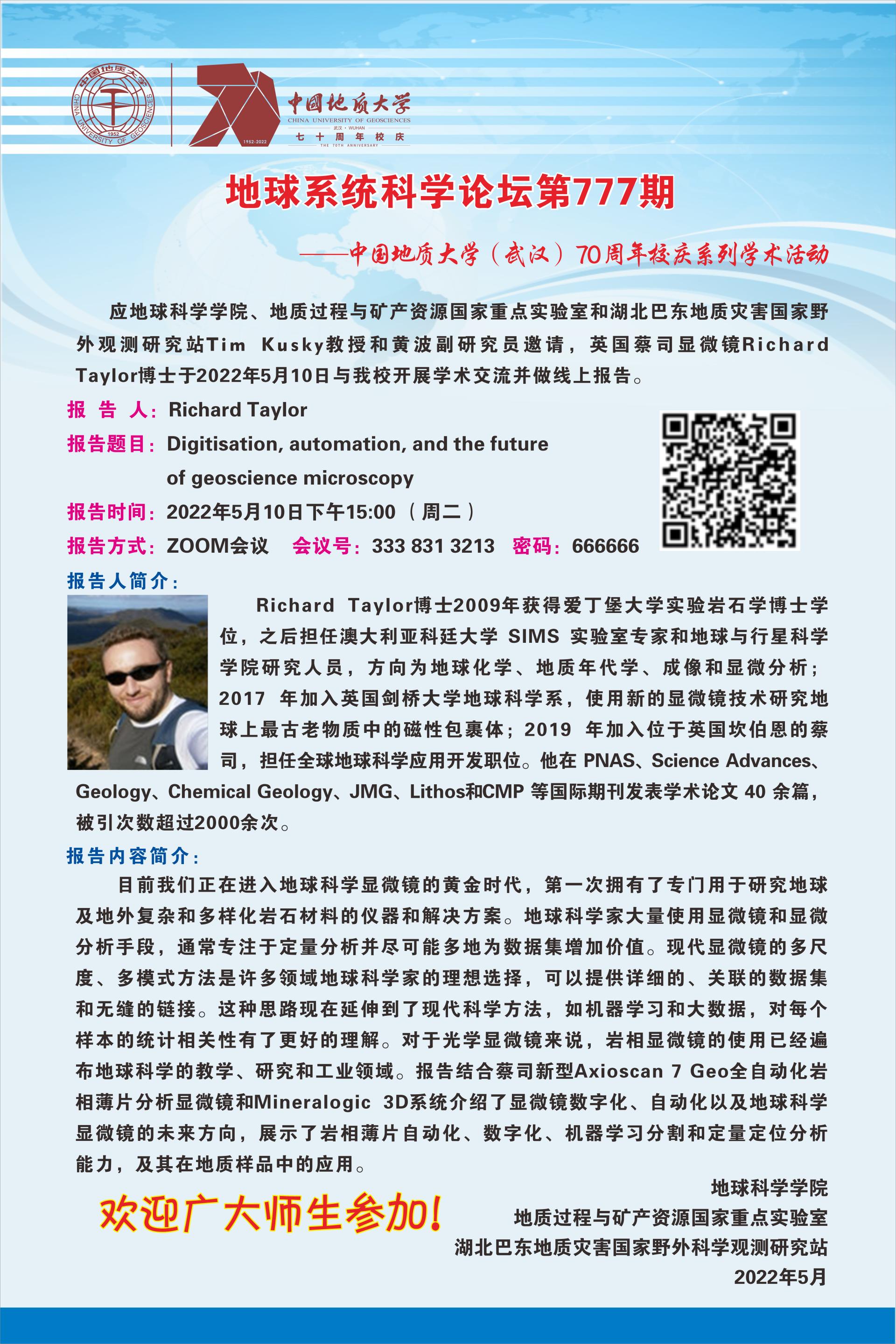 【5月10日】校庆系列学术活动---地球系统科学论坛(第777期):Richard Taylor 博士