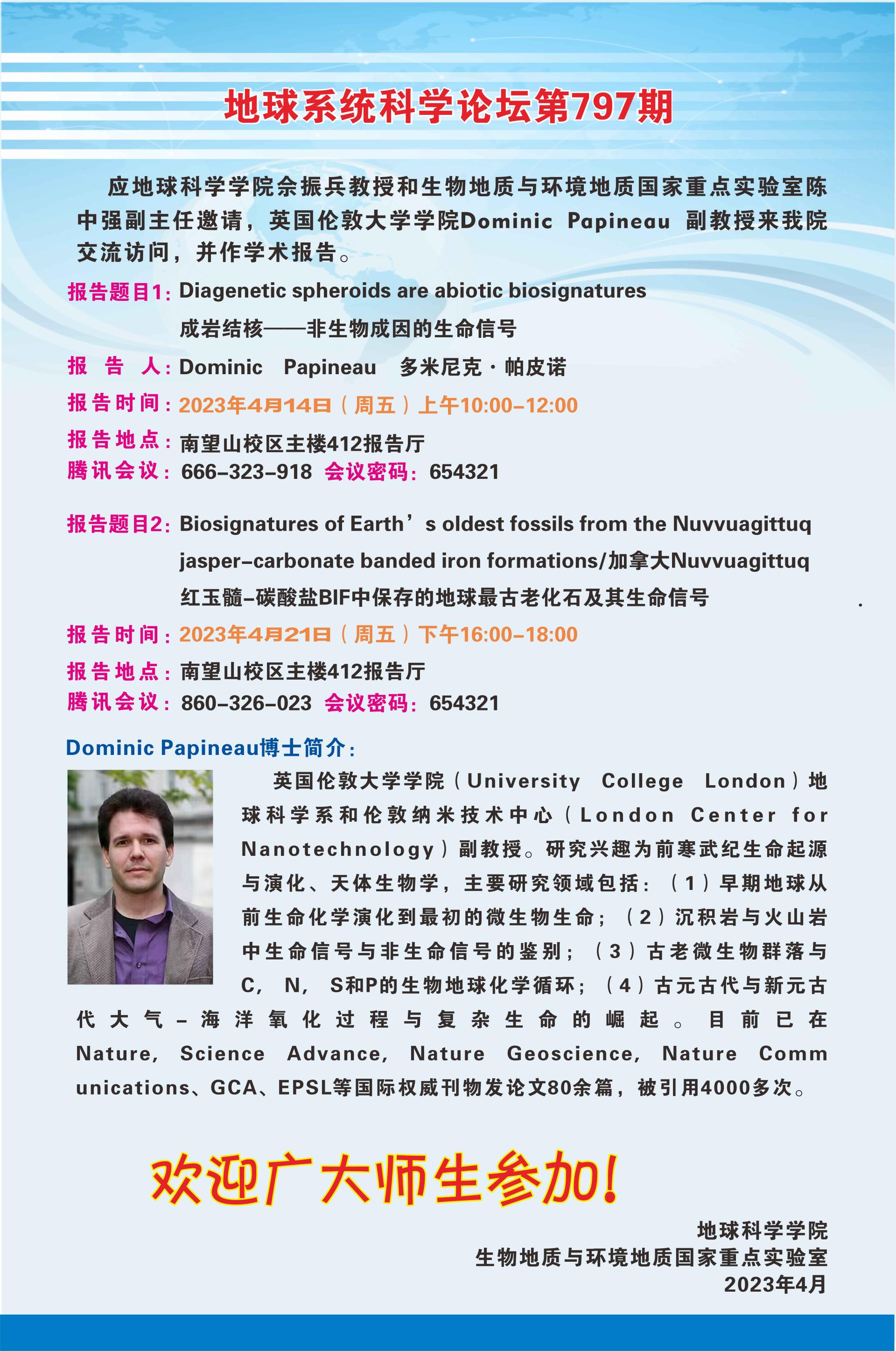 【4月14日】地球系统科学论坛(第797期)-Dominic Papineau副教授