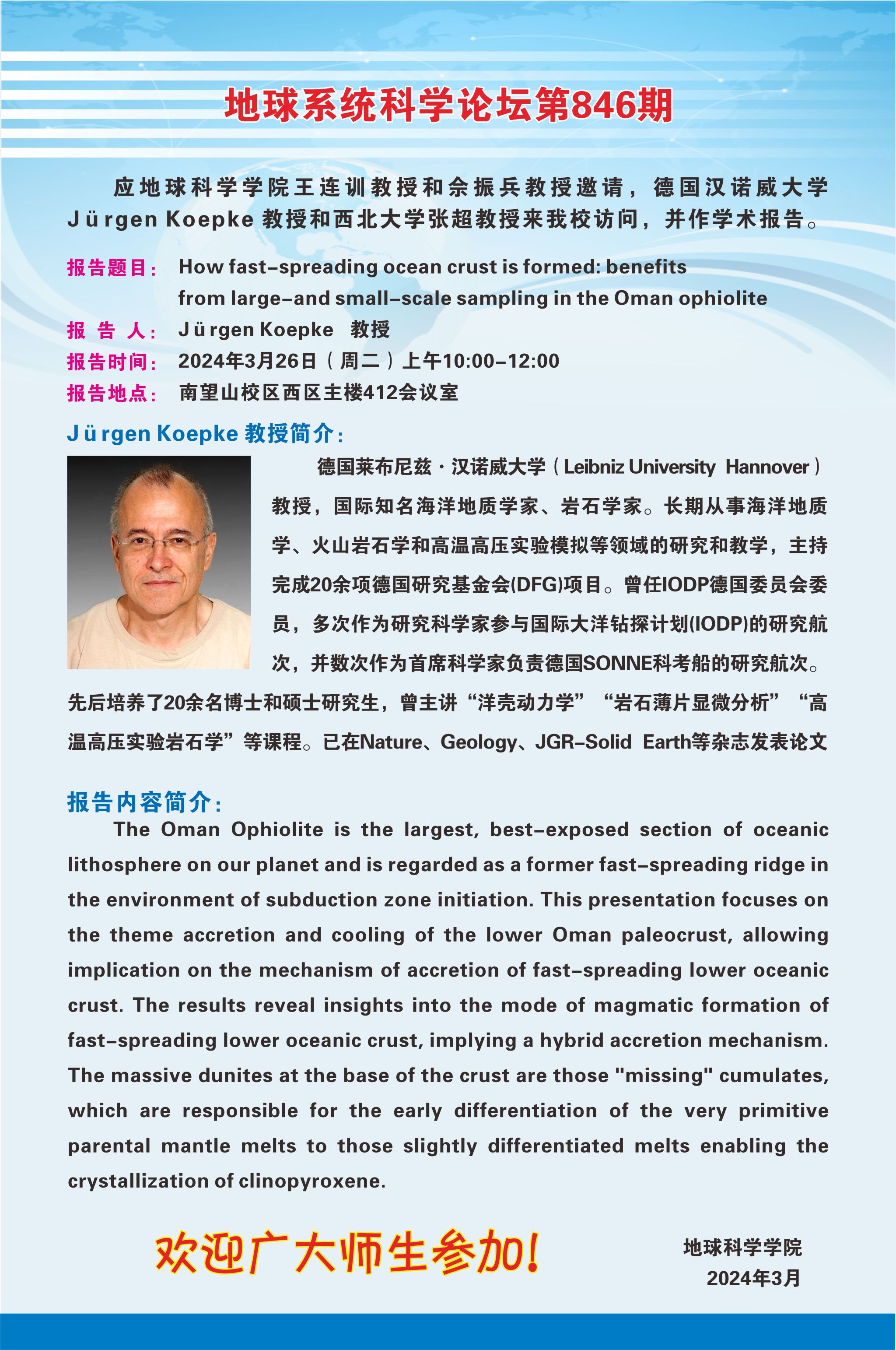 【3月26日】地球系统科学论坛第846期-Jürgen Koepke 教授
