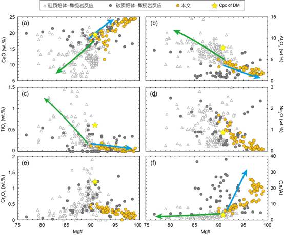图3. 熔体-橄榄岩反应产物单斜辉石成分变异趋势