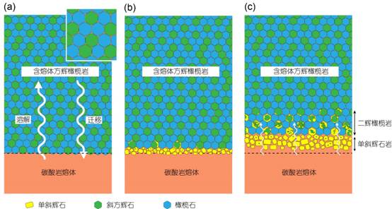 图1. 钙质碳酸岩熔体反应过程示意图