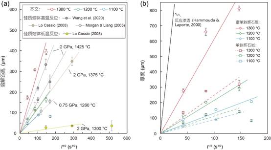 图2.方辉橄榄岩溶解距离(a)以及富单斜辉石层厚度(b)随时间的变化