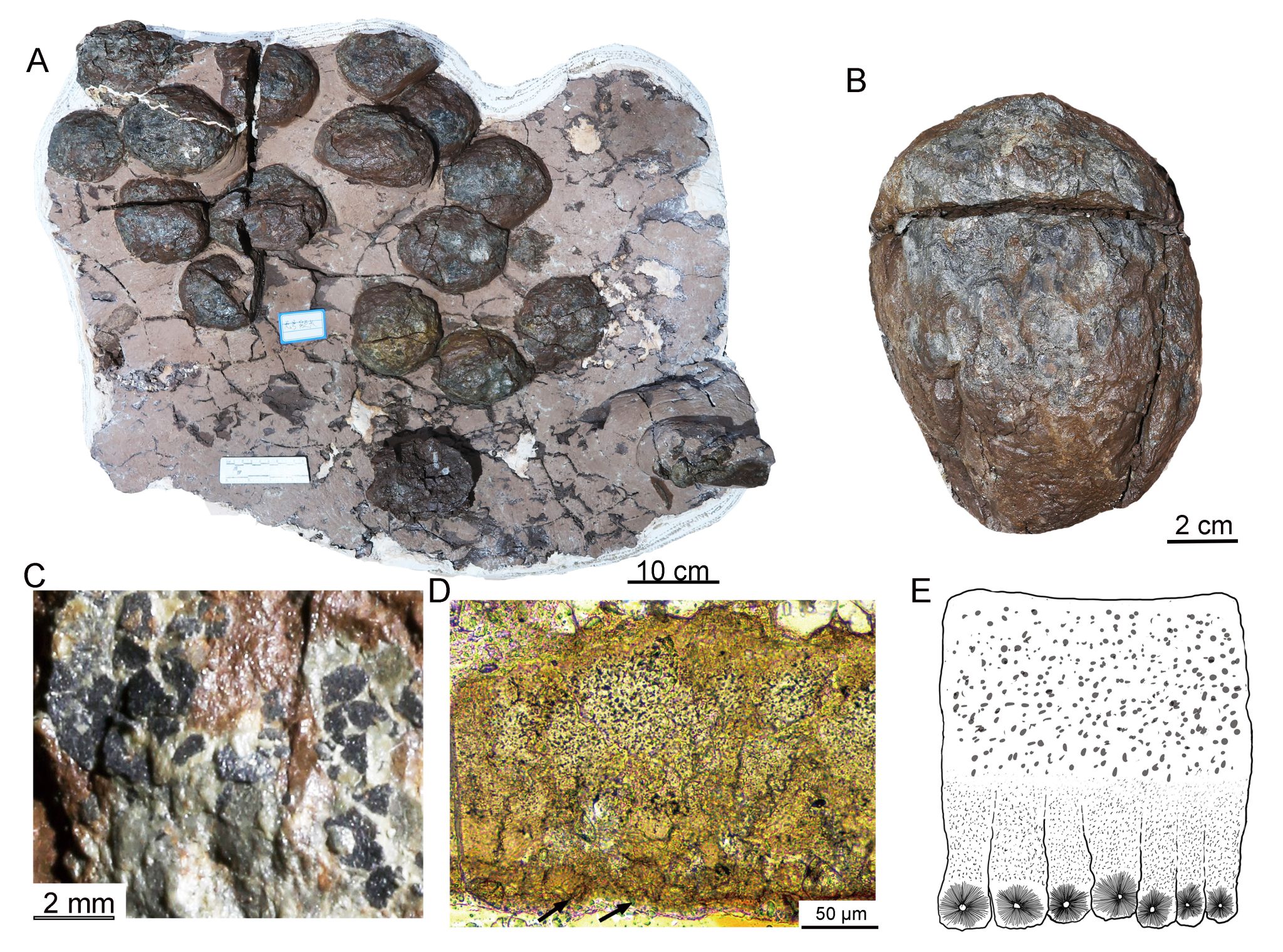 图2. 守护黔龙的蛋窝和蛋壳结构. A. 清理后的恐龙蛋窝; B. 一枚保存较完整的黔龙蛋; C. 蛋壳碎片; 蛋壳显微结构(D)和素描图(E)