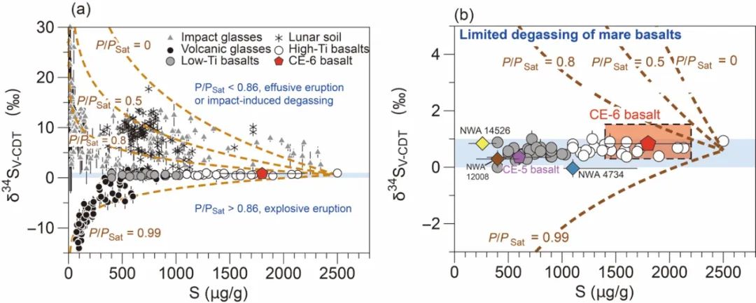 月球岩浆的去气过程主要与其喷发形式有关。嫦娥六号低钛玄武岩是典型的溢流式喷发玄武岩。由于月表近真空的环境,在岩浆喷发或流动过程中如果发生去气那么硫同位素的分馏可能以动力学分馏为主,其结果类似于月壤和冲击玻璃中观察到的重的硫同位素特征(图3)。此时,很小程度的去气(~20%)即可造成显著的硫同位素分馏(δ34S:+7‰)(Wing and Farquhar, 2015)。然而,嫦娥六号低钛玄武岩中观察到的不同岩屑中陨硫铁硫同位素的差异整体有限,这意味着硫的去气程度很低。这与嫦娥五号玄武岩以及其他月球溢流玄武岩演化特征吻合。