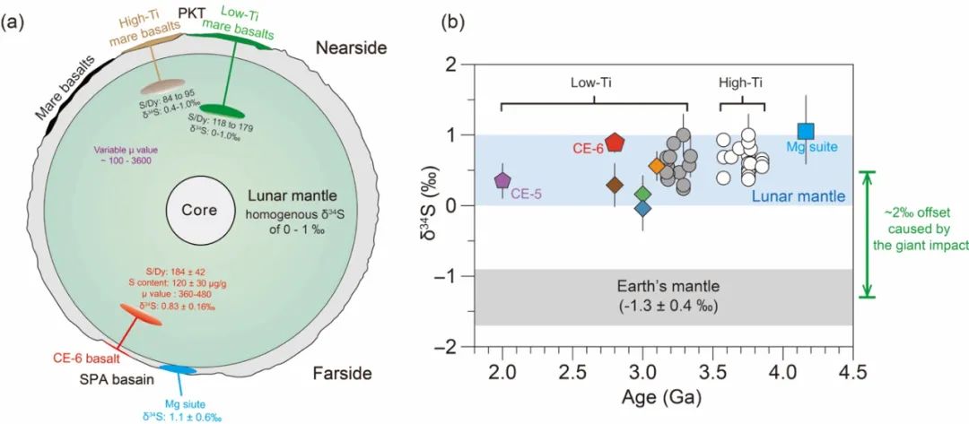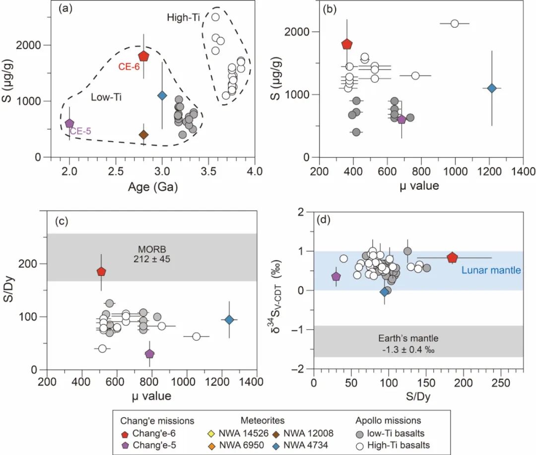我们根据嫦娥六号低钛玄武岩S/Dy估计其月幔源区的硫含量在120 ± 30 μg/g,该值与Apollo低钛玄武岩源区的高值接近(79–120 μg/g)。嫦娥六号低钛玄武岩的δ34S为0.83 ± 0.16‰,与来自月球正面PKT地体的Apollo玄武岩(δ34S:0-1‰)基本一致。这意味着发生在月球正面PKT地体附近潜在的局部去气作用并不会导致月球正面和背面挥发性元素及同位素的不均一性!并且月球内部自形成以来就具有重S同位素的特征(比地幔重~2 ‰),并且在后续的演化过程中保持稳定(图6)。