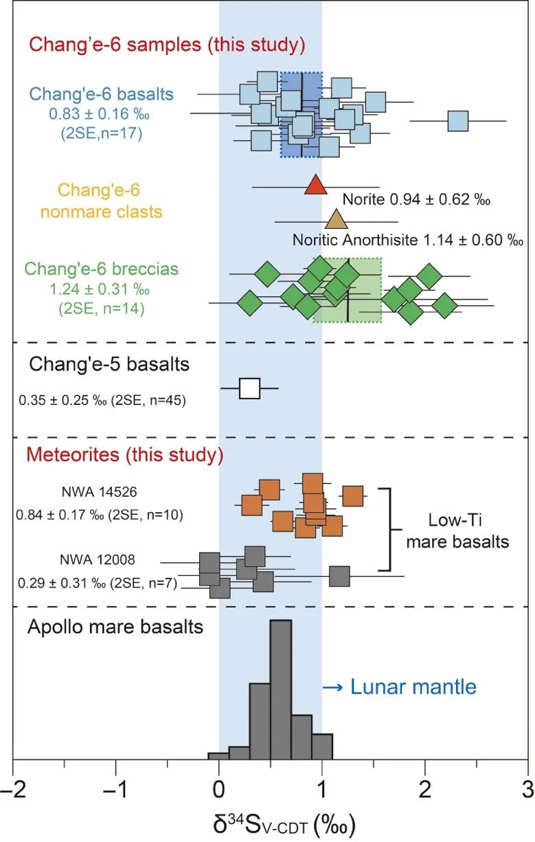 图4 嫦娥六号低钛玄武岩、非月海岩屑以及月球陨石δ34SV-CDT测试结果。