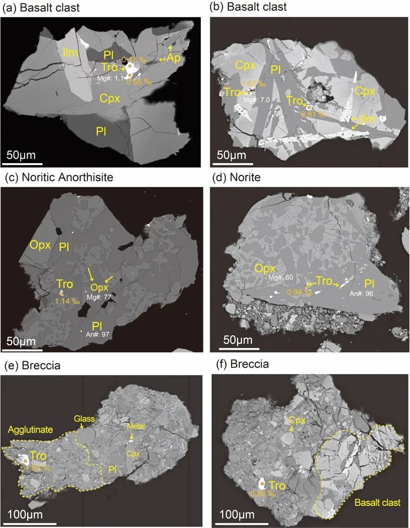 月球玄武岩中的硫主要以陨硫铁的形式存在,主要形成于玄武岩浆演化晚期,因此陨硫铁的硫同位素组成能够代表岩浆整体的硫同位素特征。但是这些硫化物粒度非常细小,大部分小于20微米。得益于中国地质大学(武汉)地质过程与成矿预测全国重点实验室激光测试方法的持续创新突破,胡兆初教授团队开发了对地质和行星样品中硫化物硫同位素的高空间分辨率(~8μm)和高精度(δ34SV-CDT: 0.50‰, 2sd)测试手段。该方法具有基体效应弱、高效低廉的显著优点,已经成功应用于嫦娥五号和月球陨石(图1,Wang et al., 2024)。中国地质大学(武汉)汪在聪教授团队对嫦娥六号月壤中的低钛玄武岩以及月壳岩屑进行了详细的岩石学和地球化学工作,来理解月背壳幔岩石的硫同位素及其与正面的异同性,取得如下进展。