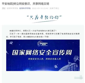 七、增强网络安全意识。广泛开展网络安全意识宣传,10月23日,安全保卫部副部长彭冠军老师以“平安校园你我同行”为主题为我院学生干部作防范电信网络诈骗安全培训,分析了当前校园反诈的严峻态势,介绍了校园常见的网络诈骗类型,叮嘱同学们增强法律和防范意识,谨防电信网络诈骗。国家网络安全学习周时期,发布《平安地院|树立网安意识,共享网络文明》推文,系统总结国家网络安全课内容,利用学生喜爱的平台及方式方法持续开展网络安全意识宣传。