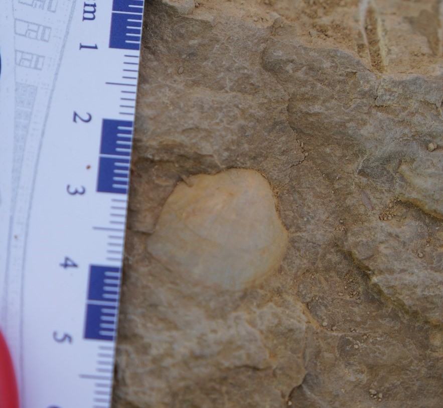 经过老师耐心细致的讲解后,大家分工协作,开始动手操作起来。夕阳和煦、春风吹拂,在山间野外,同学们完全忘记路途的疲惫和平日的烦恼,时而传来爽朗的笑声和惊叹声:“你们看我挖到了什么?这个化石标本好漂亮!”师生们听到后纷纷围到一起,原来一位同学挖到了一个十分完整的化石。“这是一枚双壳类化石,大家在野外拍照要记得放上比例尺或参照物。我们地质学讲究将今论古,这一枚小小的化石代表着4亿年前蔡甸曾是一片生机勃勃的海洋”,老师们说。