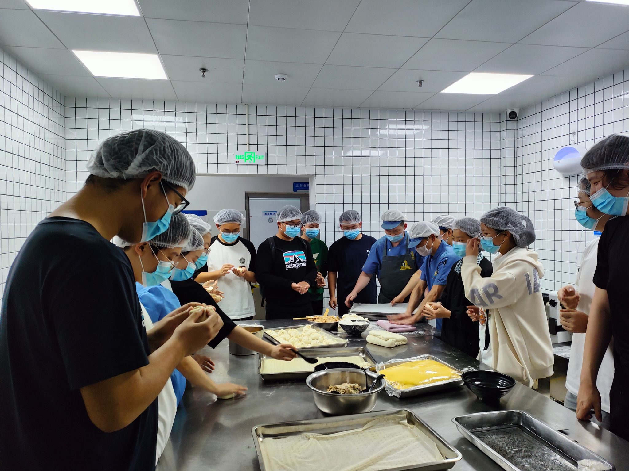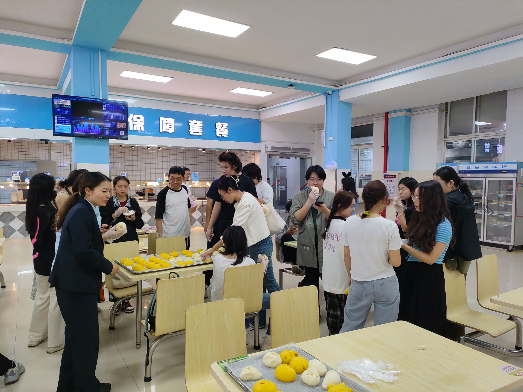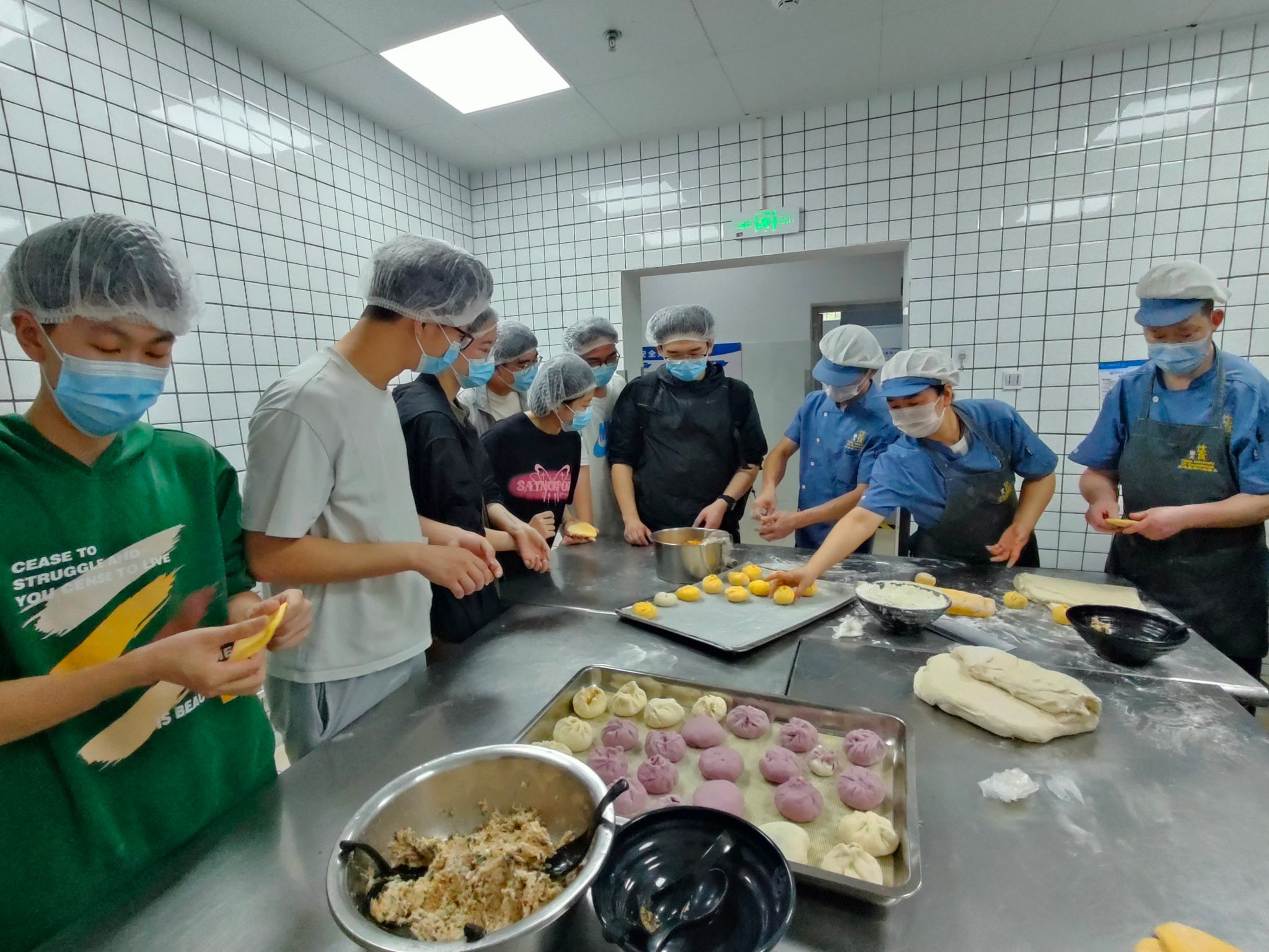 交流讨论结束,洗净双手后,大家一起前往北区食堂操作间,开展面点制作现场教学。面点师傅向学生们展示了面点的制作过程,并邀请辅导员滕笑丽老师以及学生们动手尝试。同学们热情地卷起袖子,投入到了面点制作之中。他们的动作熟练而充满个性——擀面皮、填馅料、捏造型……每一道工序都充满了欢声笑语。经过大家的共同努力,餐盘上摆满了形状各异、色彩斑斓的包子,不仅承载着饮食服务中心对同学们深深的关怀,更是装满了同学们的欢乐与满足,让人心中涌动着温馨的感动。
