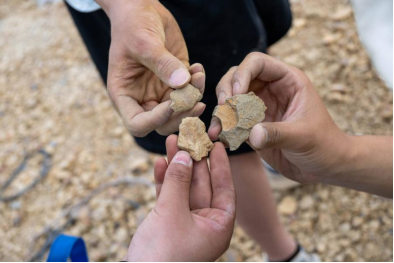 经过宋老师耐心细致的讲解后,大家分工协作,拿起地质锤,开始动手操作起来。同学们敲开一块块石头,仔细观察上面的形状纹理,有的化石比较小,同学们需要仔细观察,有不确定的问题向宋老师请教,宋老师也为同学们讲解古生物化石的形态特征、演变过程等专业知识,并告诉同学们挖化石的技巧与方法,循循善诱,让同学们在亲身实践的过程中加深对理论知识的理解。得到宋老师的点拨后,同学们的干劲更足了,更多的化石被挖出,同学们互相分享欣赏。