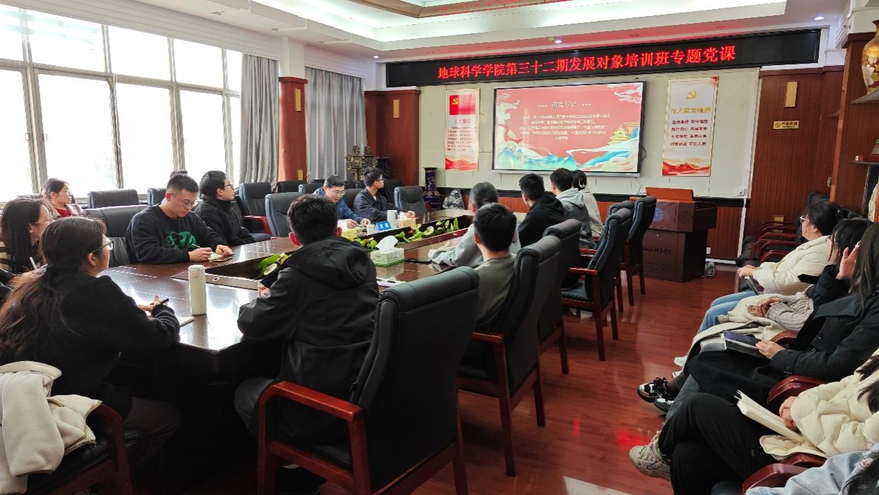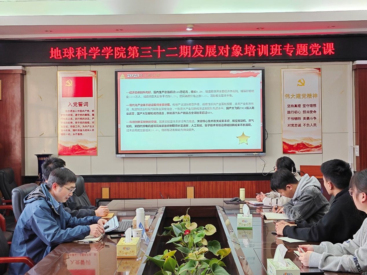 2024年3月19日,地球科学学院党委书记周刚以《踏上新征程,奋楫再出发——2024年全国两会政府工作报告重点解读》为题,为学院第32期发展对象培训班全体学员讲授专题党课。党课由辅导员滕笑丽和秦傲老师主持,21名学员一同聆听了党课。